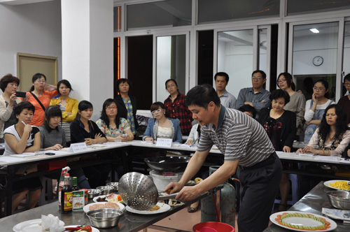 從2014年4月21日起,每逢周一晚上,公司幾十名廚藝愛好者都會興致勃勃地聚集在漳州市總工會職工業余學校,一起認認真真地學習廚藝,捧著筆記本仔細記下授課老師講解的做菜要點,睜大眼睛盯著授課老師的現場操作,從烹飪的基礎知識、刀功的基本要領、配菜的基本方法到一道道葷素搭配、家常可見的美味佳肴如芝麻雞、排糖醋肉、紅燒魚塊、椒鹽海蠣、松仁玉米、沙司茄子等,都生怕落下一個小小的細節……