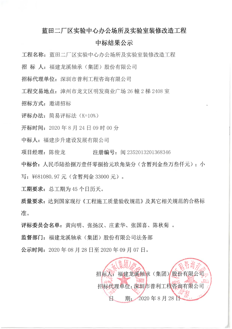 龍軸集團藍田二廠區實驗中心辦公場所及實驗室裝修改造工程中標結果公示