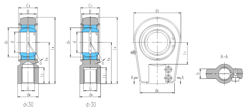產品特點:帶鎖口桿端關節(jié)軸承由桿端體和向心關節(jié)軸承GE…ES組裝而成,用擋圈固定,d≤50,桿端體材料是碳鋼,d>50,桿端體材料是球墨鑄鐵,桿端體的內螺紋帶有鎖口,配有螺釘緊固;可通過油杯潤滑。