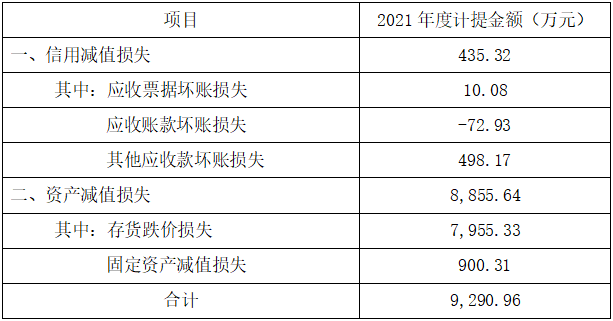根據(jù)《企業(yè)會計準(zhǔn)則》及公司會計政策與會計估計的相關(guān)規(guī)定,為真實(shí)、準(zhǔn)確地反映公司截至 2021 年 12 月 31 日的財務(wù)狀況及經(jīng)營成果,本著謹(jǐn)慎性原則,公司對截至 2021 年 12 月 31 日公司的資產(chǎn)進(jìn)行了減值測試,并與年審會計師進(jìn)行了充分的溝通,對可能發(fā)生資產(chǎn)減值損失的相關(guān)資產(chǎn)計提減值準(zhǔn)備。2021年確認(rèn)的資產(chǎn)減值損失及信用減值損失總額為9,290.96萬元,相應(yīng)減少當(dāng)年利潤總額9,290.96萬元,具體情況如下表: