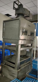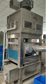 5)設備的水除塵采用專用水噴淋除塵設備。整體應采用不銹鋼制造,含支架、外殼及內部過濾網。空氣由下部通入,上部出氣(下行的水管應深入水箱底部,再讓水流溢流至過濾網,必要時增加引風機,確保含塵氣體上逸。);底部設有水池,配有浮標,池中的水可自動補充,水池底部配有排污裝置,可將粉塵等沉淀物排出;系統(tǒng)配有獨立開關,可控制除塵的啟停;箱內過濾的濾網采用不銹鋼濾網并在隔層內加裝吸塵小球,噴水閥采用消防噴水頭。具體樣式參照我司現有水除塵設備樣式,如下圖: