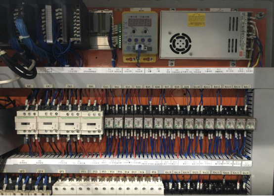 所有的電氣元器件、電線都必須要求有唯一的標識,標識的內容要求和電氣圖紙資料中的標識相一致;電氣元件標識位于電氣元件正上方,除了標出與圖紙一致的元件代號外,應標出終端負載(或控制下一層級)電氣元件的中文名稱,例如: