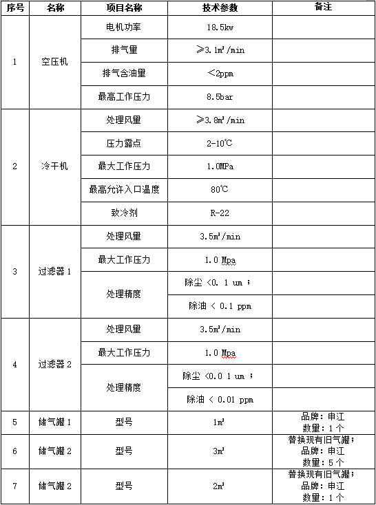 項(xiàng)目名稱:購置1套空壓機(jī)系統(tǒng)(約18.5kw,含配套冷干機(jī)、1m³氣罐、過濾器)