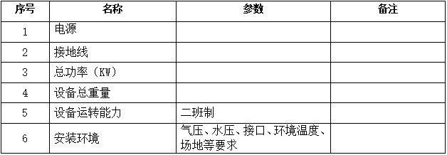 3.設備其他技術指標:(需含設備總功率、電壓、電流、氣壓、水壓、接口、環境溫度、場地等安裝環境有關要求)