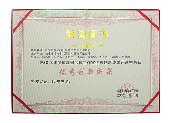 2021年1月11日,福建省總工會發(fā)布了《關(guān)于命名“福建省(示范性)勞模工作室”和發(fā)布福建省勞模工作室優(yōu)秀創(chuàng)新成果的通知》,公司陳志雄勞模工作室被命名為“福建省示范性勞模工作室”,由陳志雄帶領(lǐng)團隊完成的“航空鋁合金拉桿組件研制與應(yīng)用研究”項目被授予“福建省勞模工作室優(yōu)秀創(chuàng)新成果”榮譽稱號。