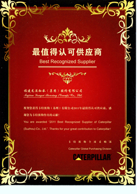 On Nov. 25,2011, Our general manager Xiasheng Xu came to Xuzhou to attend the Caterpillar supplier conference. At the conference, Caterpillar (Suzhou) Co., Ltd. Granted our company “ Best Recognized Supplier” as the honorary title. This represents that our products and service have been fully recognized by International machinery giant Caterpillar, and shows that our economic and trade ties now stand at a new starting line.