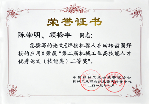 日前,由我司員工陳崇明、顏楊豐撰寫的論文《焊接機器人在回轉齒圈焊接的應用》榮獲由中國機械工業企業管理協會、機械工業職業技能鑒定指導中心聯合舉辦的“第二屆機械工業高技能人才優秀論文評選活動”技能類二等獎。