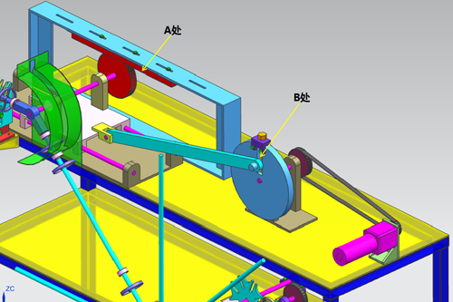 圖4為串料機構的機械傳動圖,其工作原理是:當串料桿堆滿了套圈和隔套后,電機接到感應開關的信號后啟動并開始工作,通過同步帶驅動槽輪機構實現間歇式轉動,串料盤轉過45°后電機立刻停止,此時二次循環串料開始。圖中A處所示的串料盤有八根串料桿,可實現間歇式的連續串料工作,提高設備的工作效率;B處的槽輪機構,主要實現串料桿轉盤做固定角度45°間歇式擺動,起到輪換串料的功效,便于人工卸下滿料桿和更換空料桿。