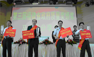 2012年10月19日上午,第三屆福建省政府質量獎頒獎大會在莆田召開,我司被福建省人民政府授予“2011年度福建省政府質量獎”,成為我市首家榮獲此獎項的企業。福建省質量技術監督局局長黃維禮、莆田市人民政府市長梁建勇等領導出席大會并為獲獎單位頒獎,圖為公司黨委書記、董事長曾凡沛接受獎杯和獎金。