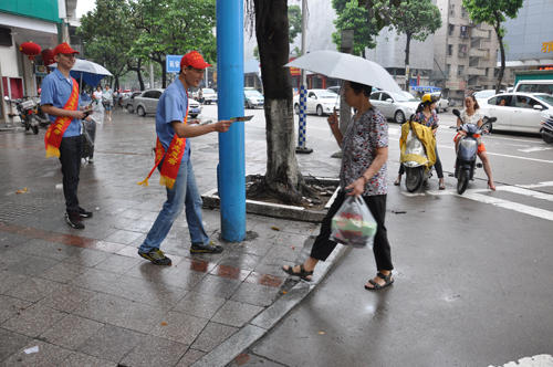 (圖a)志愿者深入到龍軸新村延安北路街頭,為過往行人分發(fā)安全生產(chǎn)宣傳資料。