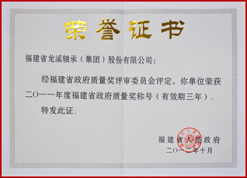 2012年10月19日上午,第三屆福建省政府質量獎頒獎大會在莆田召開,福建龍溪軸承(集團)股份有限公司被福建省人民政府授予“2011年度福建省政府質量獎”,成為漳州市首家榮獲此獎項的企業。福建省質量技術監督局局長黃維禮、莆田市人民政府市長梁建勇等領導出席大會并為獲獎單位頒獎,福建龍溪軸承(集團)股份有限公司黨委書記、董事長曾凡沛出席大會并接受獎杯、獎金。